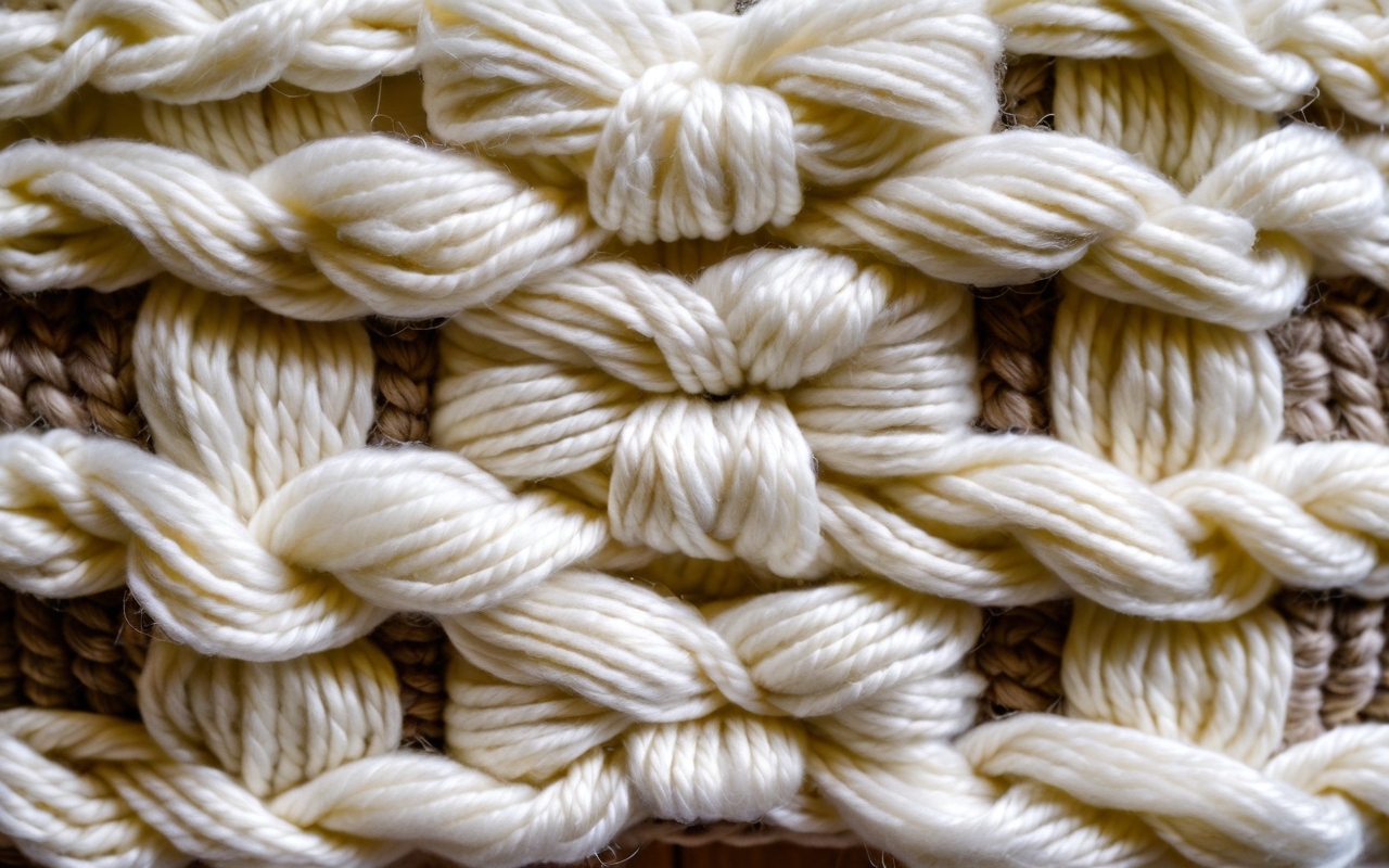 Используйте пряжу с хорошей структурой и стабильной толщиной. Плотность и текстура пряжи влияют на четкость линий волн и объем шишечек. Наиболее эффектно узор смотрится при использовании многоцветных ниток или двухцветных схем, что позволяет подчеркнуть детали.